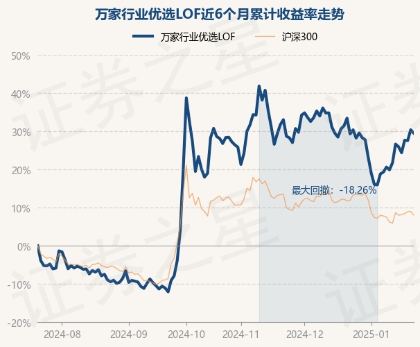 本站消息,1月22日,万家行业优选LOF最新单位净值为0.9492元,累计净值为4.2803元,较前一交易日下跌0.68%。历史数据显示该基金近1个月下跌2.94%,近3个月上涨0.69%,近6个月上涨29.53%,近1年上涨24.03%。该基金近6个月的累计收益率走势如下图: